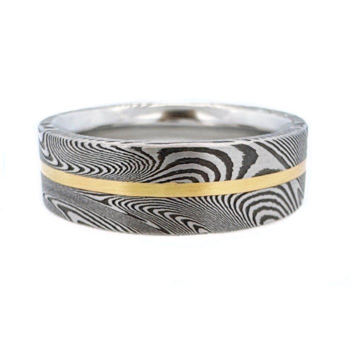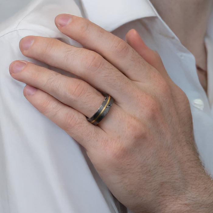 Chris Ploof also specializes in Mokume Gane, an ancient Japanese metalworking practice in which Layers of precious metals, such as rose gold and platinum, are fused together under high heat and pressure. The Mokume Gane pattern is apparent in this Meteorite Maple Wedding Band, where the metal is then twisted and bent to create unique swirls and lines, evoking at once a wood pattern and cosmic influence.
