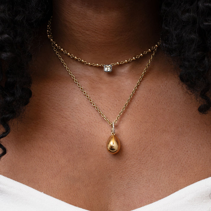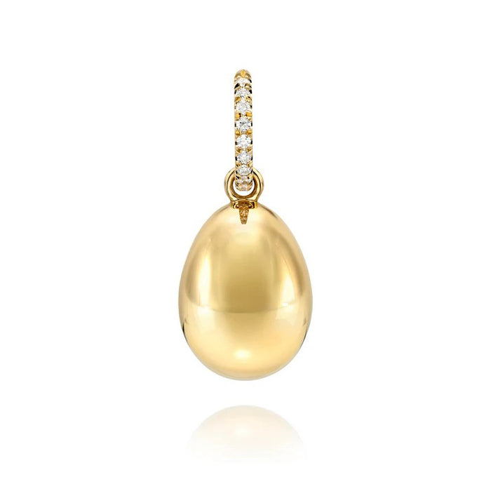 The Petra charm by Single Stone, an elegant egg-shaped design handcrafted in glowing 18k yellow gold, is crowned with an old European cut diamond bale, adding a delicate hint of vintage charm and refined sparkle to any chain or layered look.